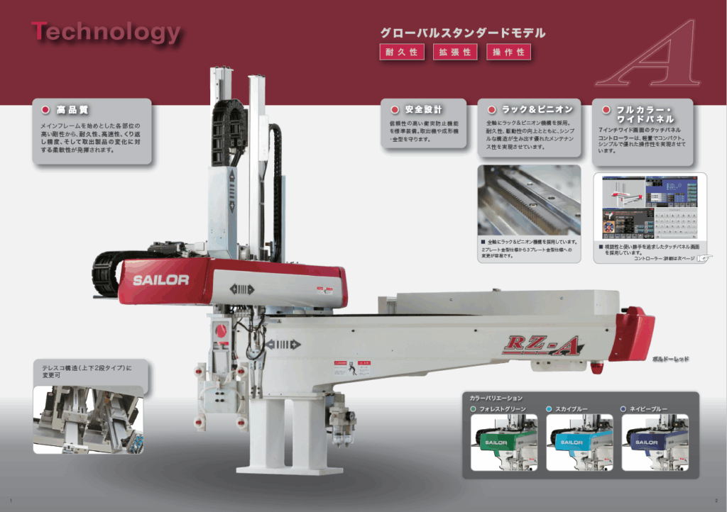RZ-Xシリーズの後継機として国内生産用に開発された汎用型の取出機です。汎用型ですが高剛性、高速性、繰り返し精度、カスタマイズ性に優れた製品です。駆動方式は引き続きラック&ピニオンを採用。シンプルな機構が優れたメンテナンス性を実現させています。RZ-Aシリーズから横走行部の両端カバー、水平部の両端カバー、水平部オイルカバーのカラーバリエーションがボルドーレッド、フォレストグリーン、スカイブルー、ネイビーブルーの4種類から選べるようになっております。