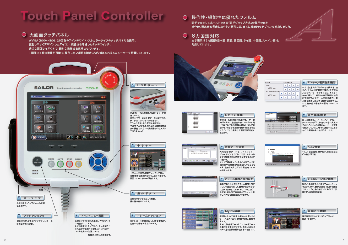 フルカラー・7インチワイド画面の操作パネルは軽量で操作性・機能性に優れたフォルムデザインを追求しました。操作はタッチパネルで識別しやすいアイコンや視認性を考慮したタッチスイッチ、1画面で5軸の操作が可能など確かな操作性を実現させています。