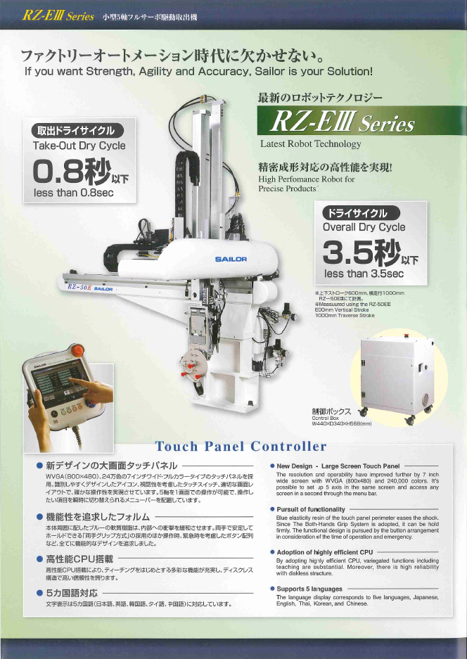 RZ-EⅢシリーズ(2010-2015) 2025.08.21 PDF (4MB) RZ-EⅢシリーズの特徴 RZ-EⅡの後継機となります。操作パネルコントローラが変わりました。ΣⅡ以降で使用しているものと同じTPC-Lという型式のものです。従来のコントローラより軽量で操作性に優れています。