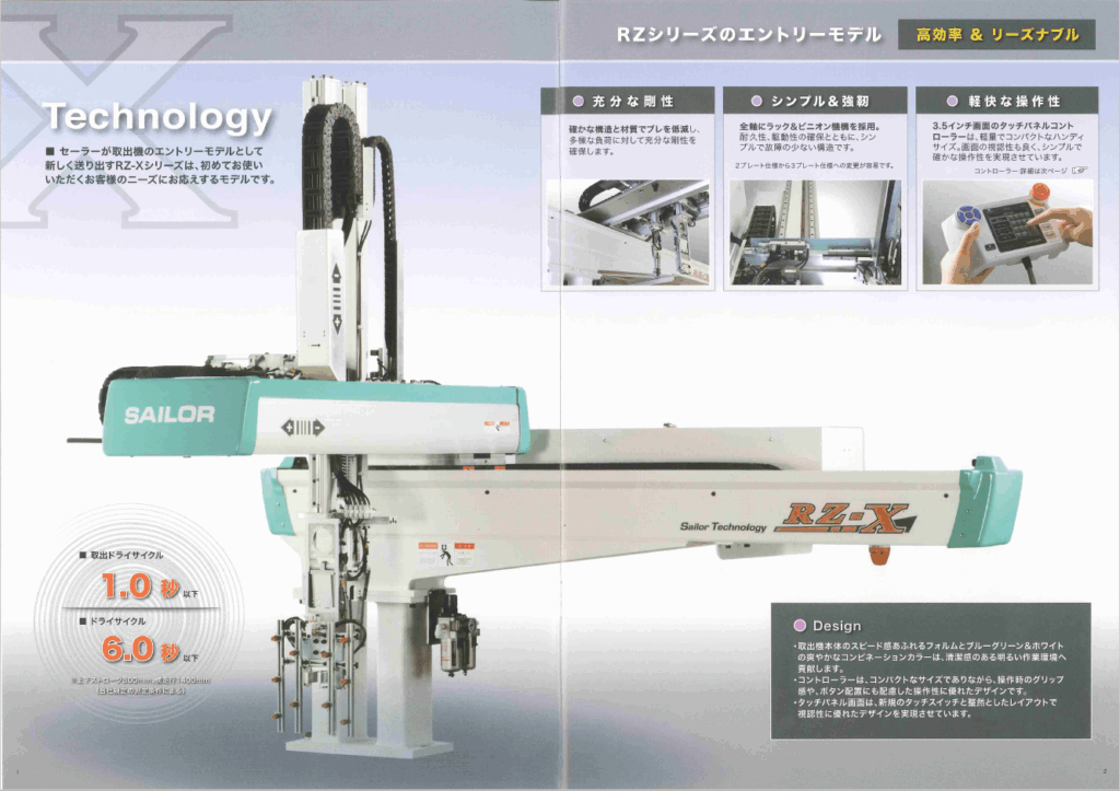 RZ-αⅡの後継機となります。同時期に発売されたRZ-Σと比べて低価格な汎用型の取出機です。はじめて取出機をお使いいただくお客様にお応えするモデルです。汎用型ですが確かな構造と材質のメインフレームはブレを低減し、多様な負荷に対して十分な剛性を確保します。またαⅡまでは走行と上下軸はラック&ピニオン機構、水平移動はボールねじ機構でしたが、Xから全軸ラック&ピニオン機構を採用。シンプルな構造はメンテナンスに優れ、永くご愛用頂くことが出来ます。