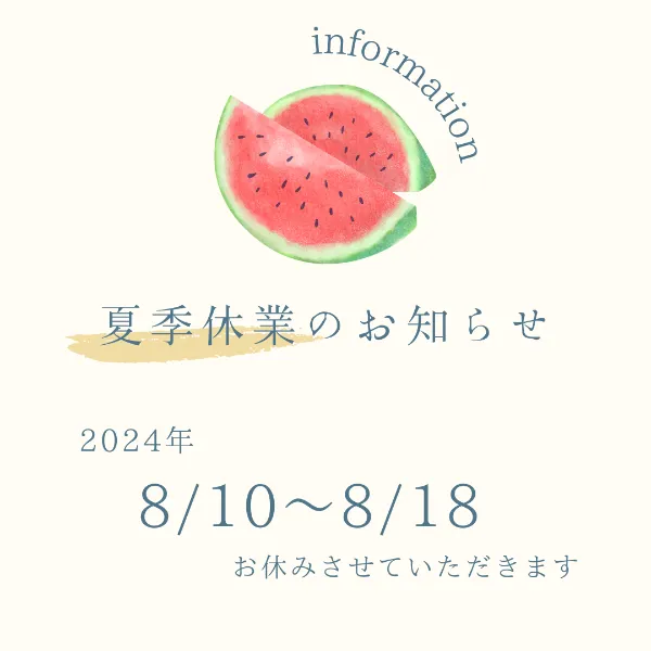 2024年夏季休業のお知らせ 2024.07.25 下記期間は休業とさせていただきます。 2024年8月10日(土)~8月18日(日) 休業期間中にいただいたご注文・お問合わせにつきましては、8月19日(月)より順次対応いたします。どうぞよろしくお願いいたします。